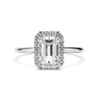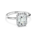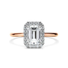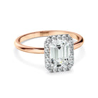 This timeless custom-made engagement ring, made with your choice of diamond centre stone, features an emerald cut diamond adorned in a halo of round brilliant cut diamonds. Exuding fluidity in its line work, and boasting an elegant silhouette, as with all the pieces in our Bespoke Collection, this piece is made especially for you.