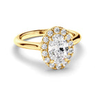 Made with your choice of diamond centre stone, this timeless custom-made engagement ring features an oval cut diamond centre stone with a halo of diamonds. Exuding fluidity in its line work, and boasting an elegant silhouette, as with all the pieces in our Bespoke Collection, this piece is made especially for you.