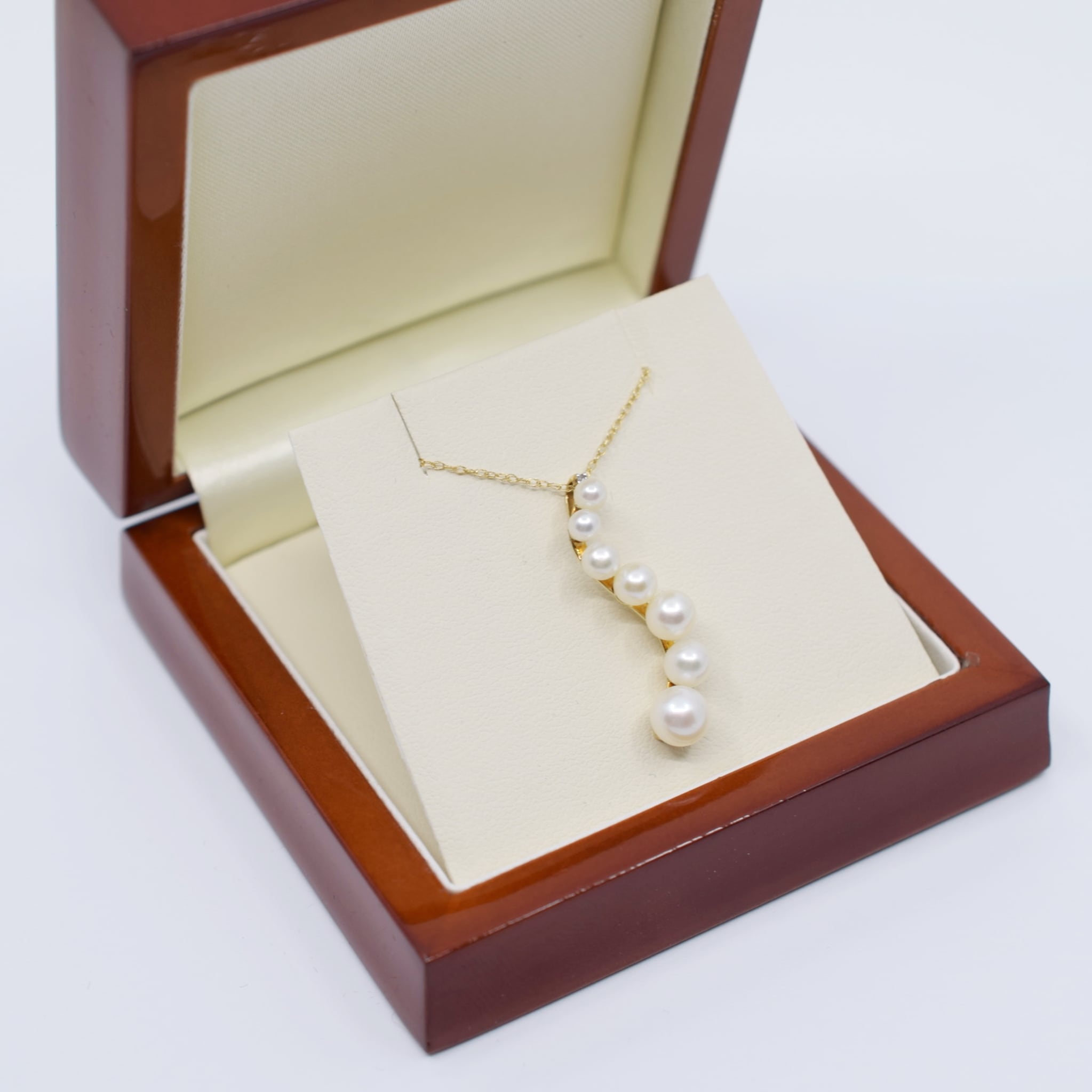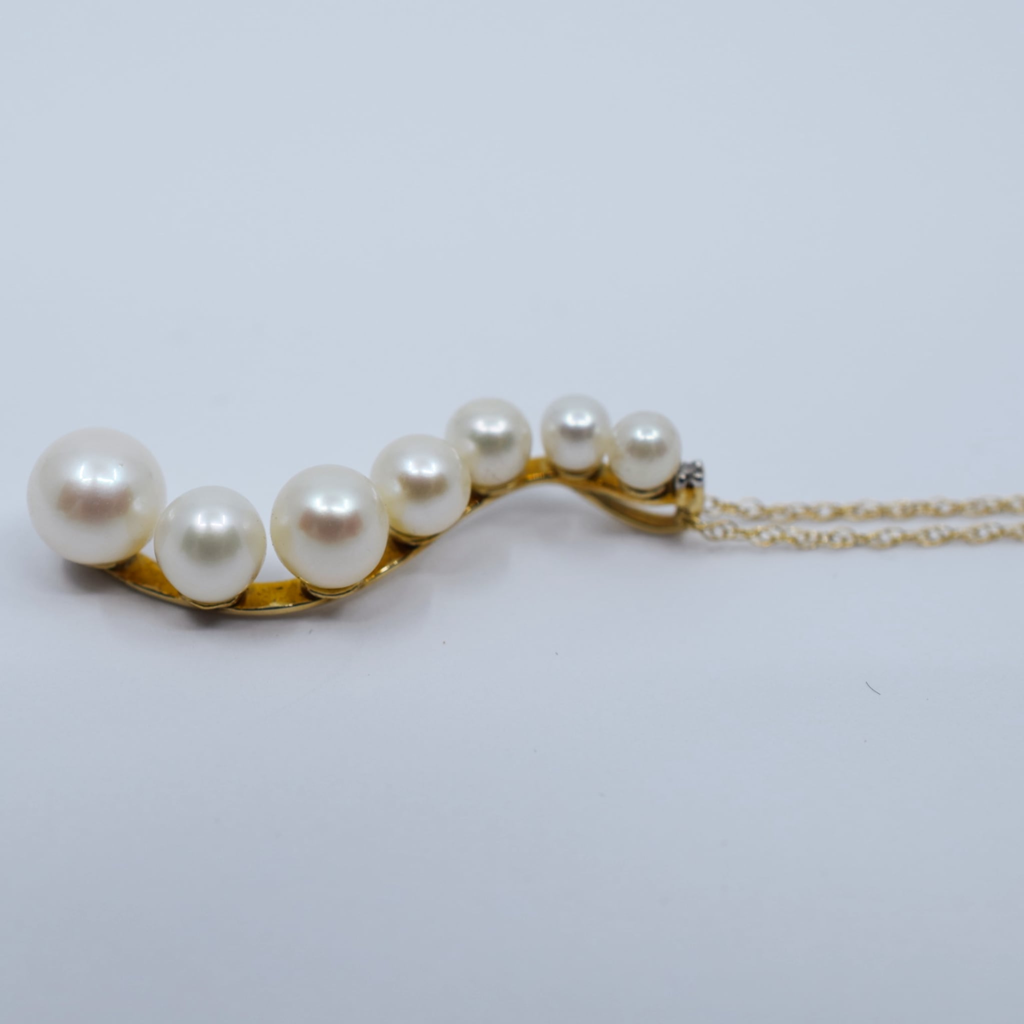 This necklace features seven gorgeous white cultured freshwater pearls with a small diamond accent on a curved 10ct Yellow Gold pendant on a fine 45cm 10ct Yellow Gold rope chain.