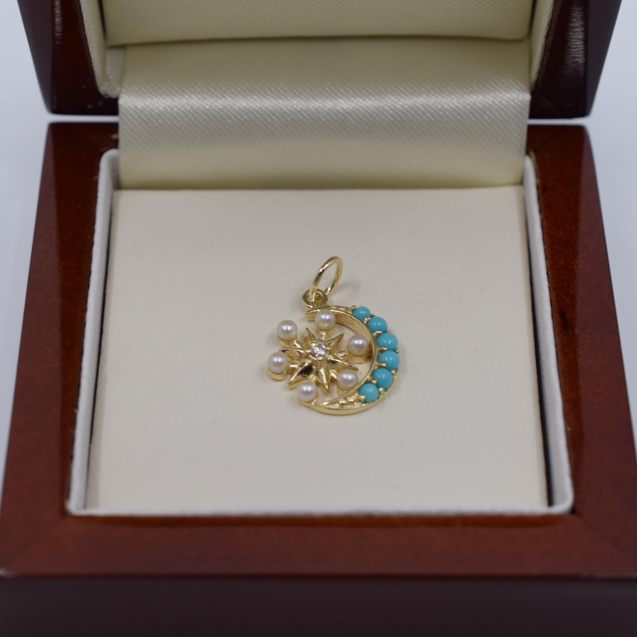 Crafted from solid 10ct Yellow Gold, this beautiful crescent moon and star pendant features stunning turquoise, seed pearls and a diamond. The crescent moon features six round turquoise cabochon stones and the star has six stunning seed pearls and a diamond centre, giving this a truly antique feel.