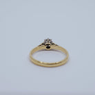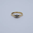 What a simply elegant ring. Crafted from 9ct Yellow Gold, it features a 0.10 carat diamond in a 9ct White Gold illusion setting with cathedral shoulders down to the ring. It has a full set of hallmarks for W.E.G, 9ct Gold, Birmingham) and 1978. The quality and design of this ring is superb.
