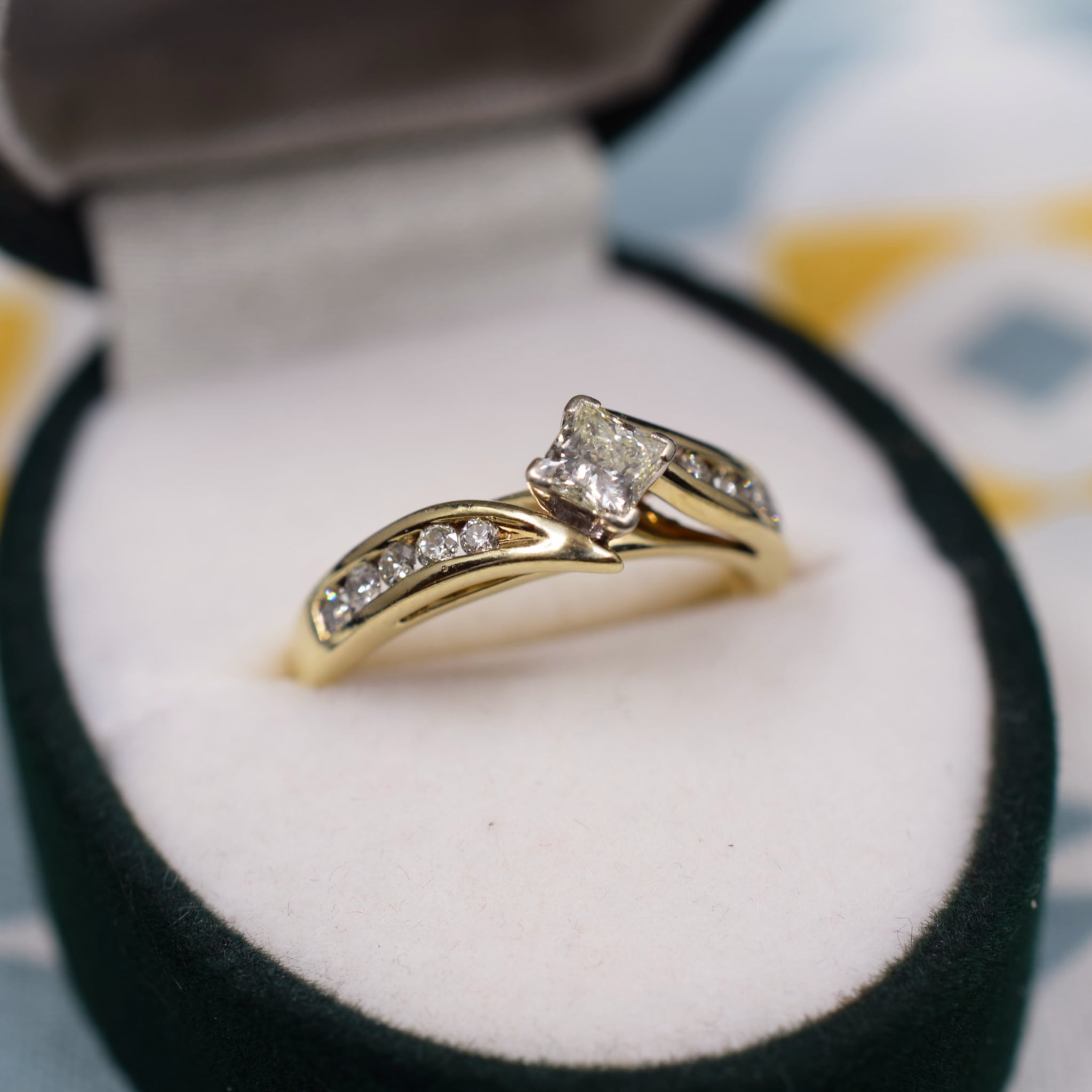 Made to shine, this simply stunning 9ct Gold ring features two types of cuts of natural white diamonds. Taking pride of place is a 3.6mm princess cut diamond in a raised four claw 9ct White Gold setting. The sweeping shoulders in a bypass design each feature five 1.5mm round brilliant cut diamonds (for a total of 10).