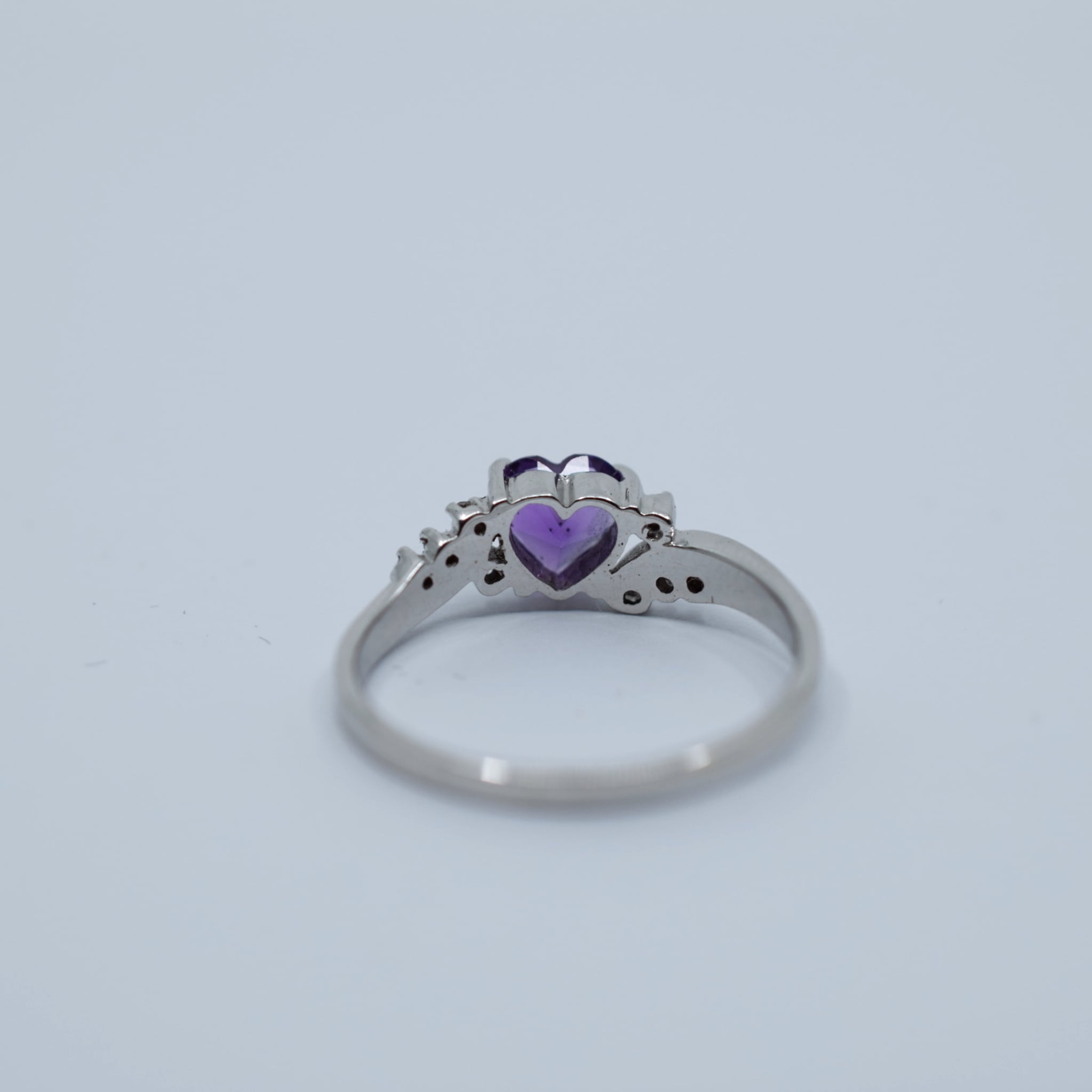 Made from 9ct white gold, this ring features a beautiful heart shaped amethyst with a nice rich purple colour. The claw set amethyst really shines in the contemporary bypass setting with diamond accents to add some extra interest to the ring. The band itself is nice and solid and hasn't been hollowed out inside near the shoulder.