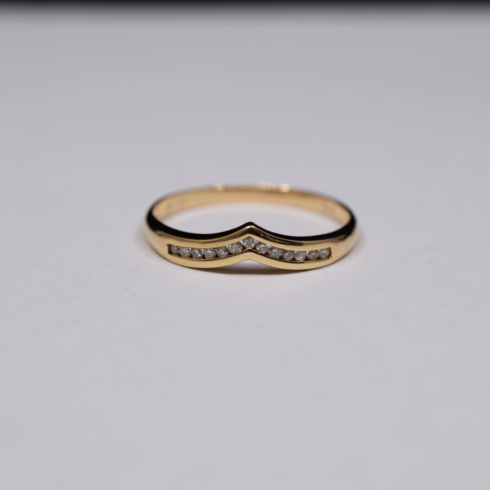 This beautifully dainty 9ct Yellow Gold ring features thirteen channel set round brilliant cut diamonds in a classic half eternity style.