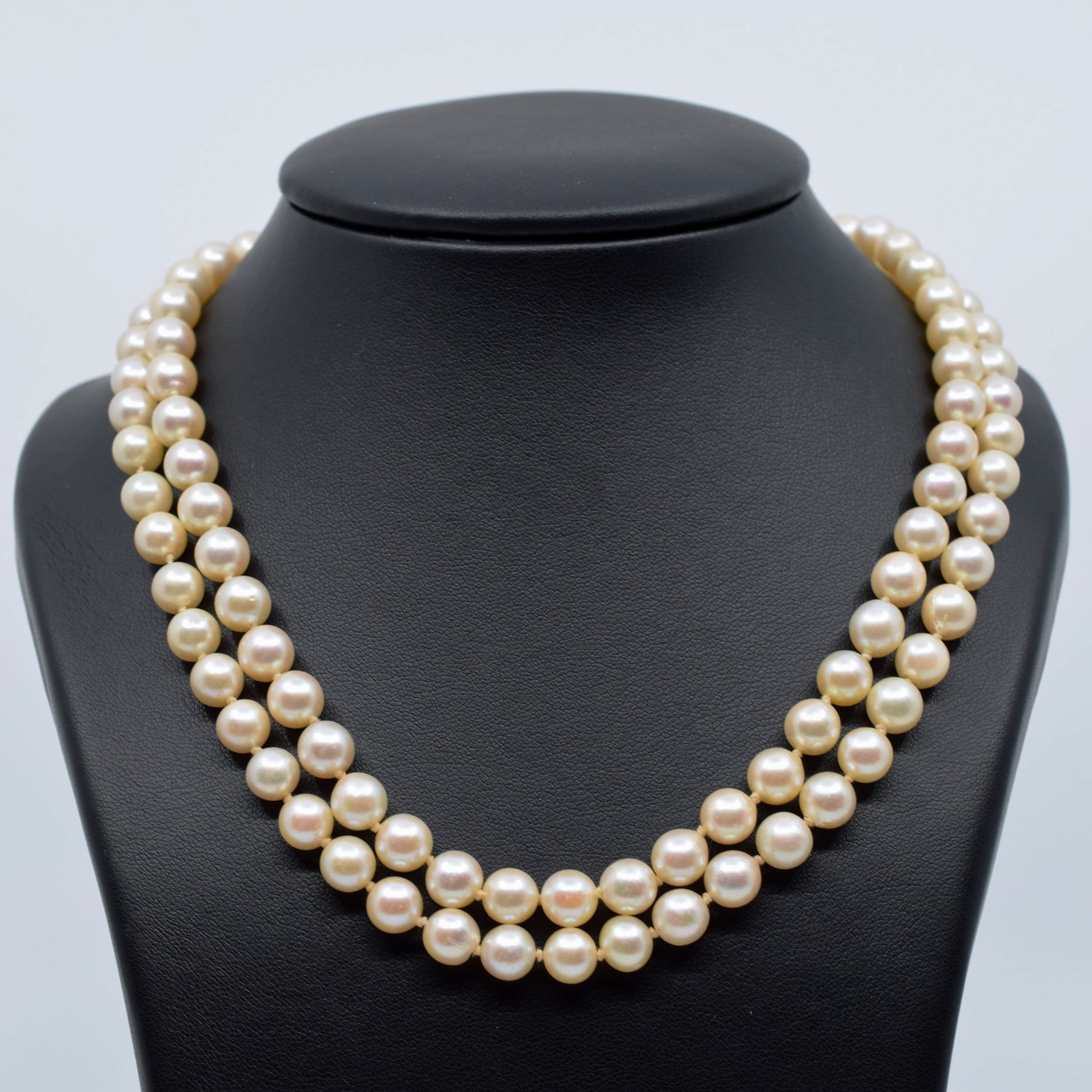 Very Good - Excellent. The pearls themselves have a lovely cream colour, good nacre with good lustre and satin reflection. The shape is round to slightly off round. Very good matching with little variation. The clasp is in excellent condition with very little wear and solid closing mechanism.