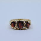 This absolutely gorgeous 9ct gold ring in the traditional 'London Bridge' setting truly is a sight to behold. It features three rich oval almandine garnets with the centre garnet surrounded with four brilliant cut round diamonds. All beautifully set in an exquisitely detailed and engraved setting with detail down the shoulders. The piercing in the gallery allows light in and shows the stones off beautifully.
