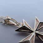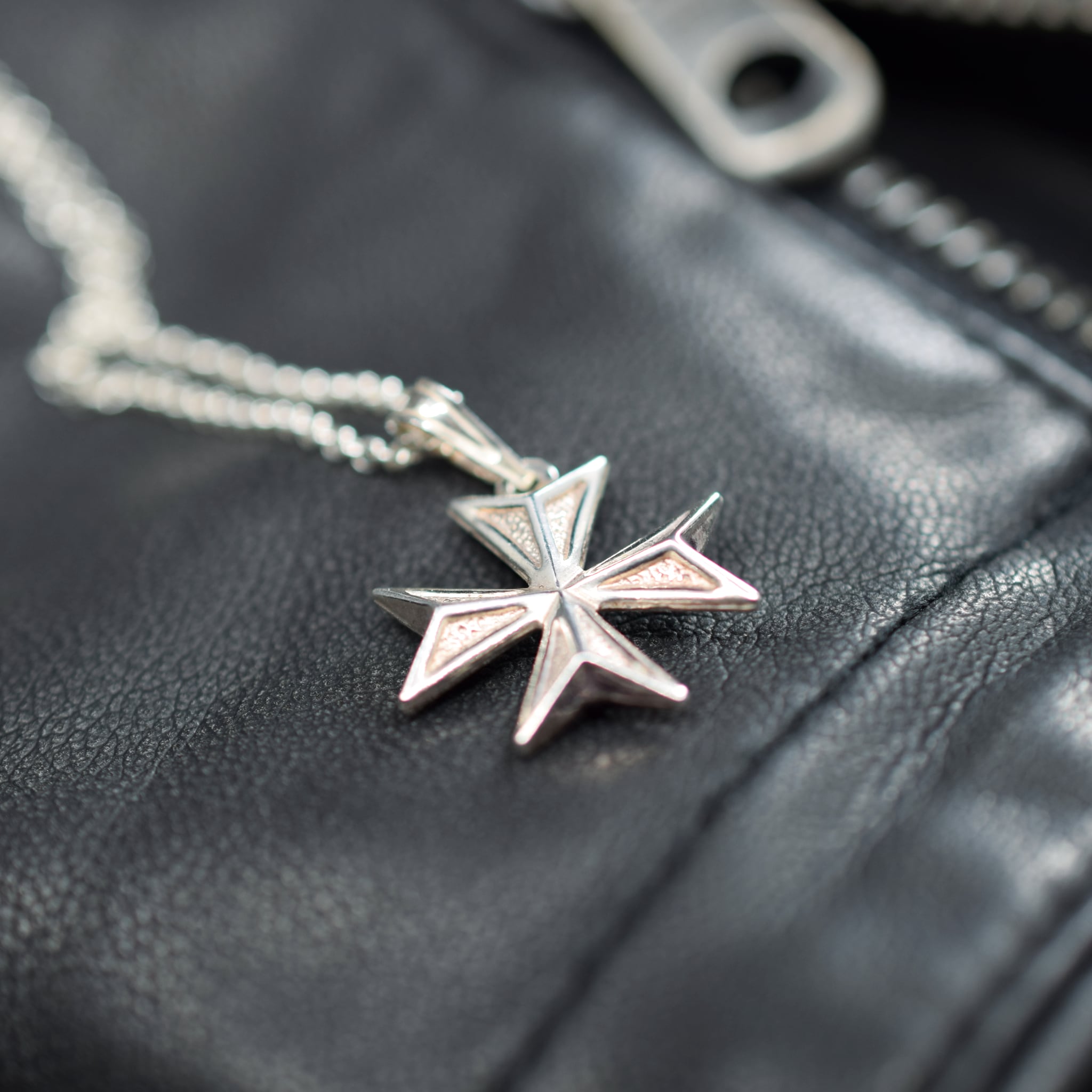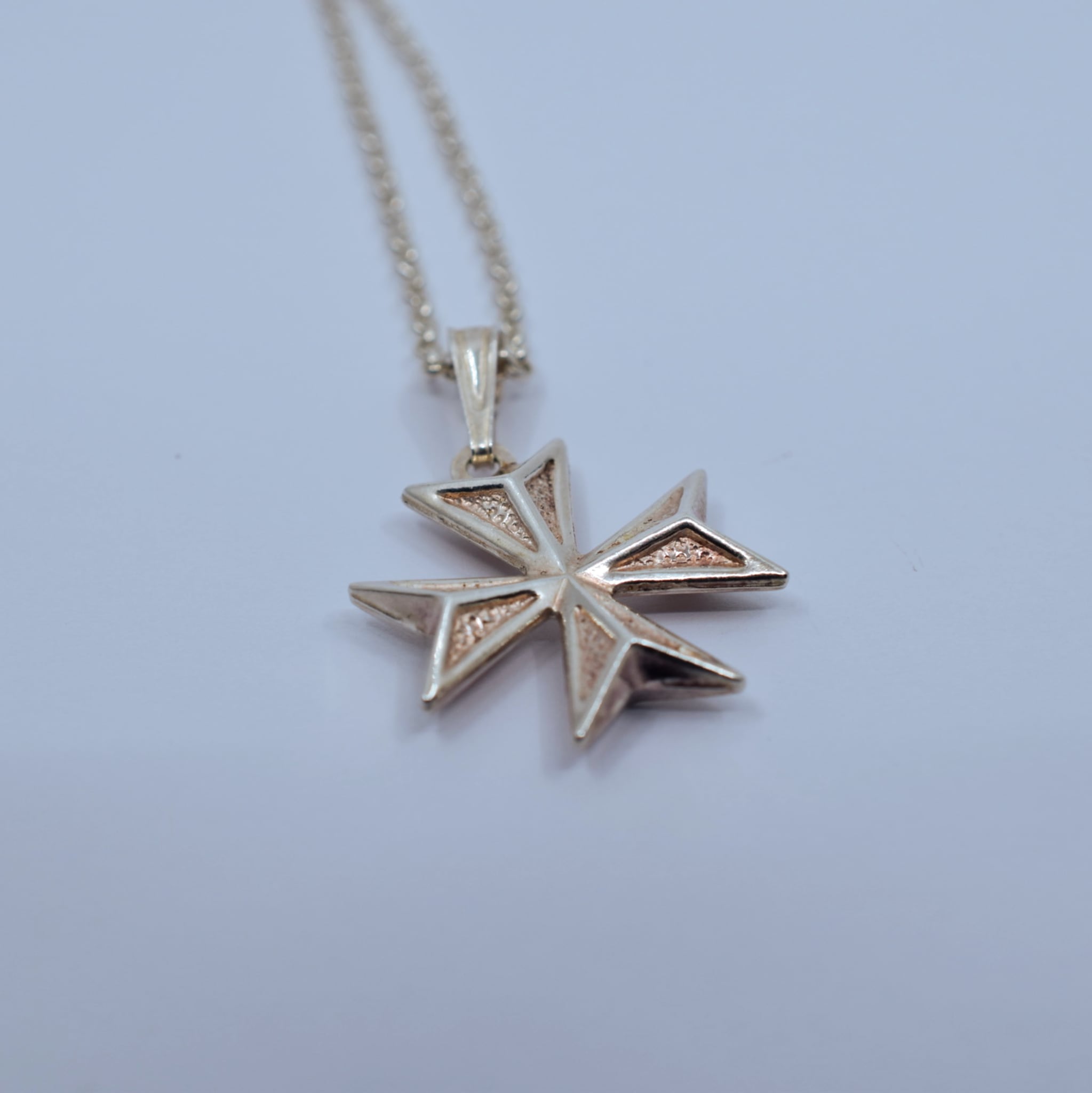 This beautiful Maltese Cross pendant has some uniqueness owing to the beautiful light red rhodium plating on the textured parts of the eight points in the design. Made from Sterling Silver, the texturing and addition of colour help bring some depth to the cross.