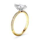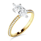 This timeless custom-made marquise cut diamond solitaire ring, made with your chose of diamond centre stone, features two rows of round brilliant cut pave set diamonds set across a knife edge band. Exuding fluidity in its line work, and boasting an elegant silhouette, as with all the pieces in our Bespoke Collection, this piece is made especially for you.