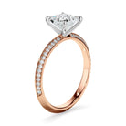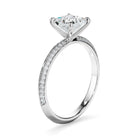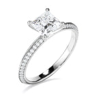 This timeless custom-made princess cut diamond solitaire ring, made with your choice of diamond centre stone, features two rows of round brilliant cut pave set diamonds set across a knife edge band. Exuding fluidity in its line work, and boasting an elegant silhouette, as with all the pieces in our Bespoke Collection, this piece is made especially for you.