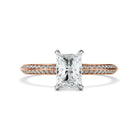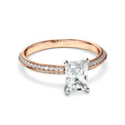 This timeless custom-made radiant cut diamond solitaire ring, made with your choice of diamond centre stone, featuring two rows of round brilliant cut diamonds pave set across a knife edge band. Exuding fluidity in its line work, and boasting an elegant silhouette, as with all the pieces in our Bespoke Collection, this piece is made especially for you.