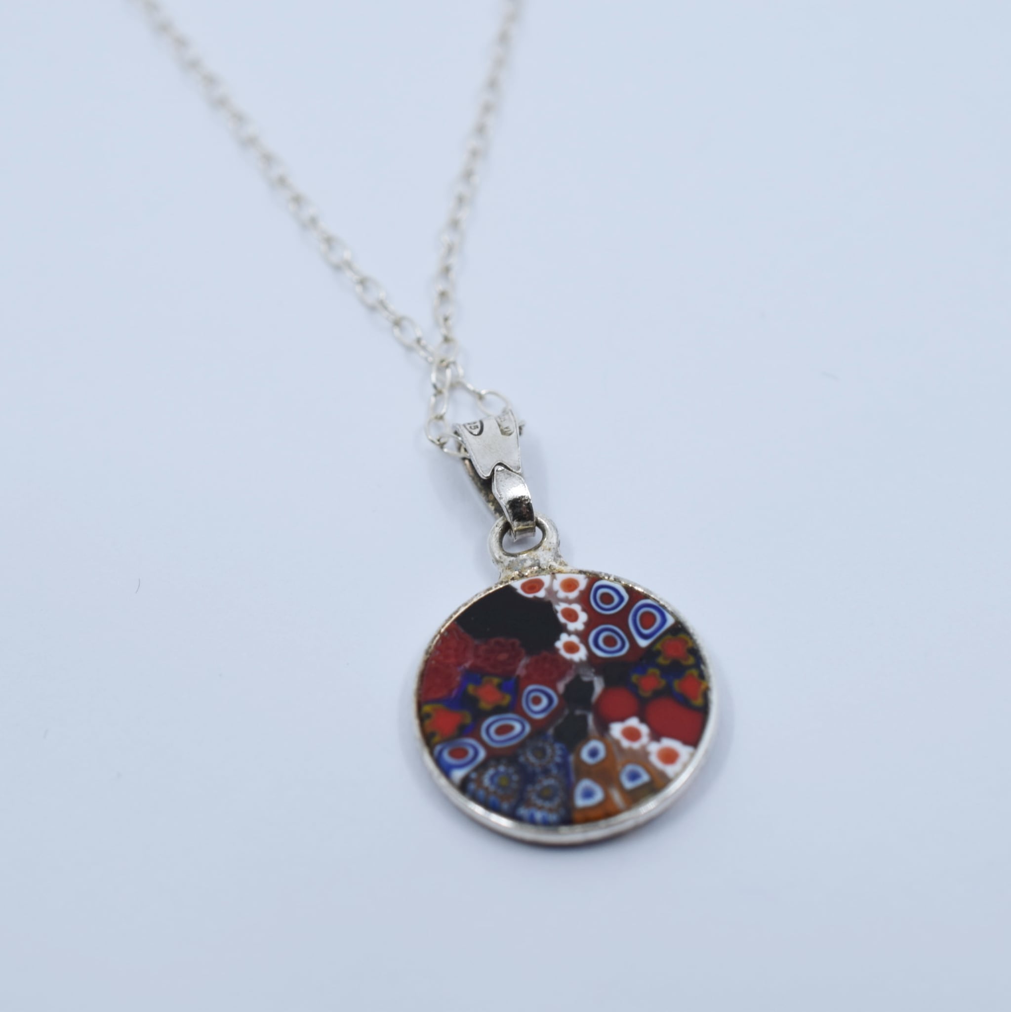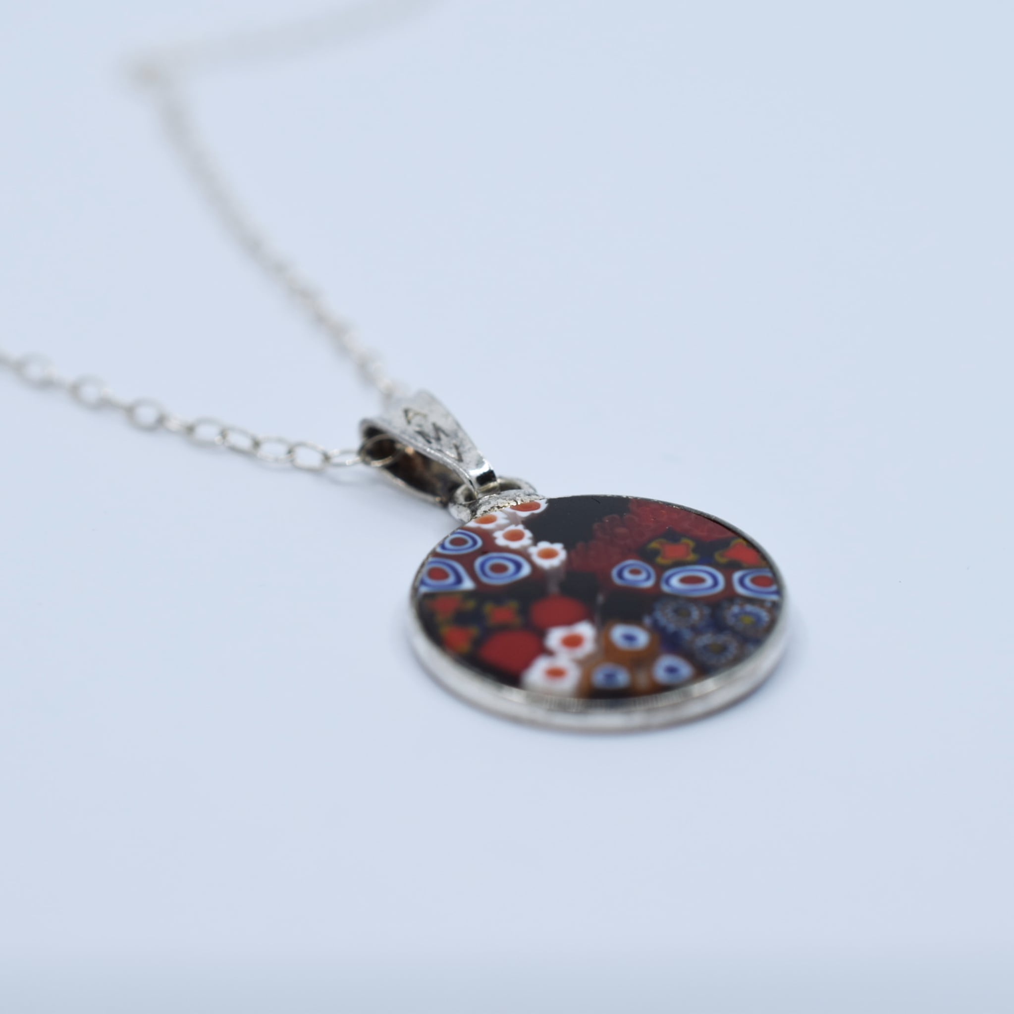 This absolutely captivating millefiori pendant is handmade in Italy by Antica Murrina Veneziana. Showcasing a circular millefiori glass section with vivid blue, red, white and black colours in a Sterling Silver bezel. It is almost reminiscent of a coral landscape you would find in the ocean.