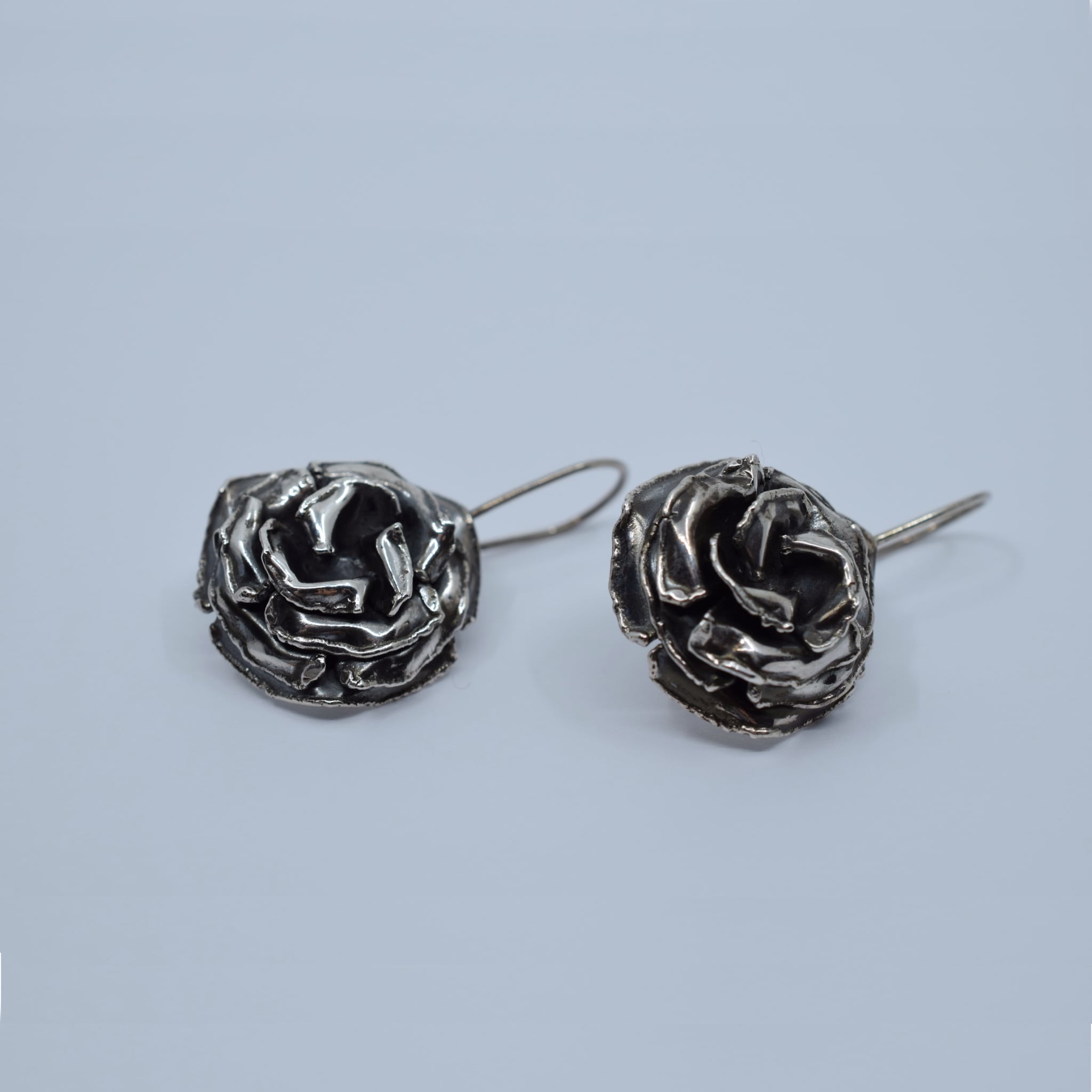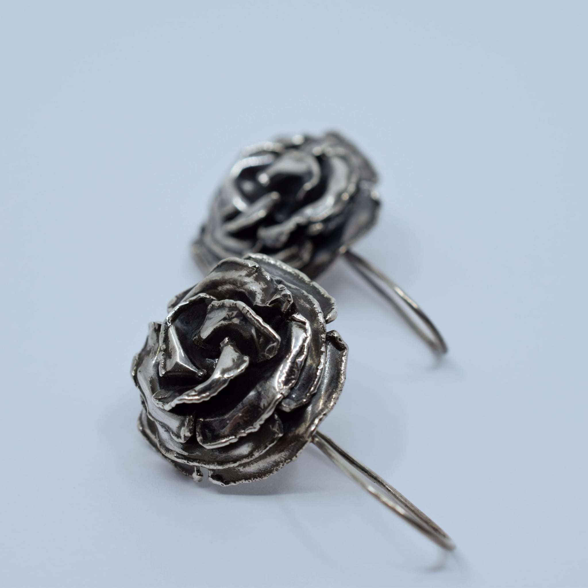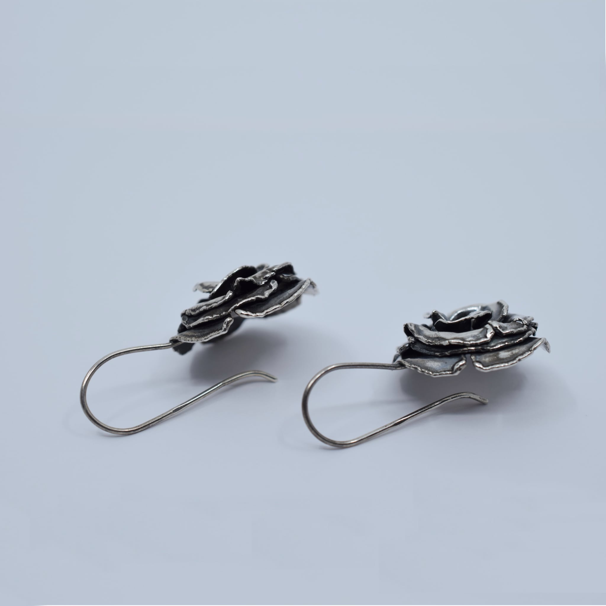 These impressive earrings have been crafted from Sterling Silver which has been 'antiqued' to give it a vintage feel. The beautiful rose design has been layered up which makes them very three dimensional with a proper handcrafted feel. The way the silver has been formed into petals is a testament to the crafting that went into making this beautiful ring.